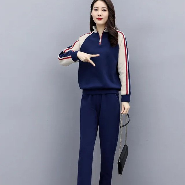 ชุดเสื้อกางเกงผู้หญิง คอตั้ง ตัดสีคลาสสิก