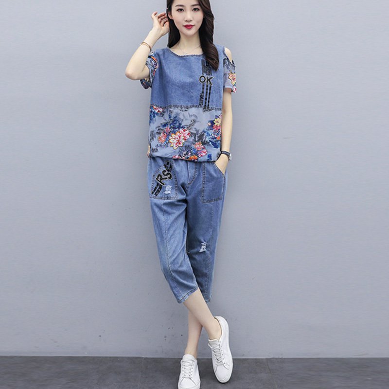 ชุดผ้าเดนิมผู้หญิง พิมพ์ลาย สไตล์ลำลอง